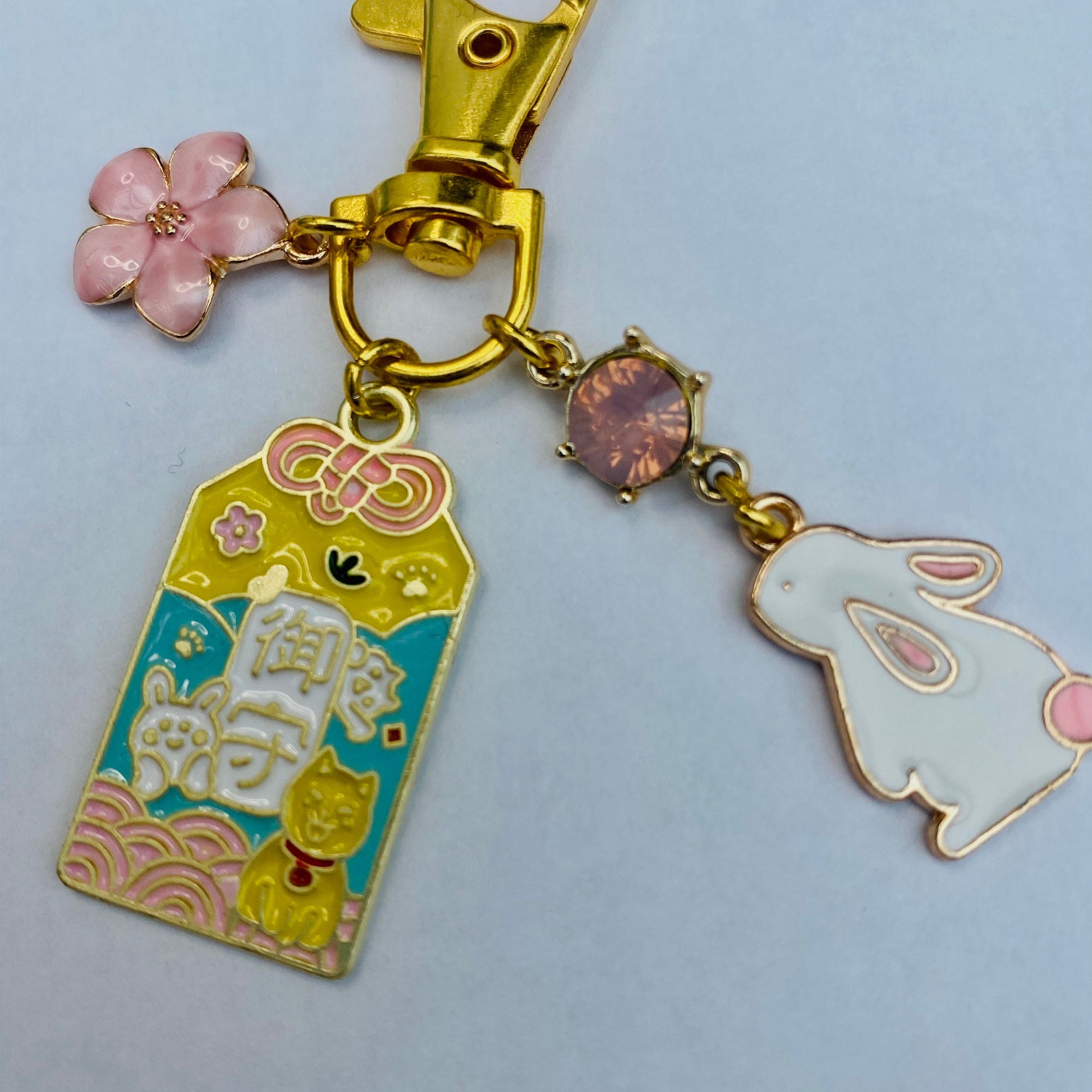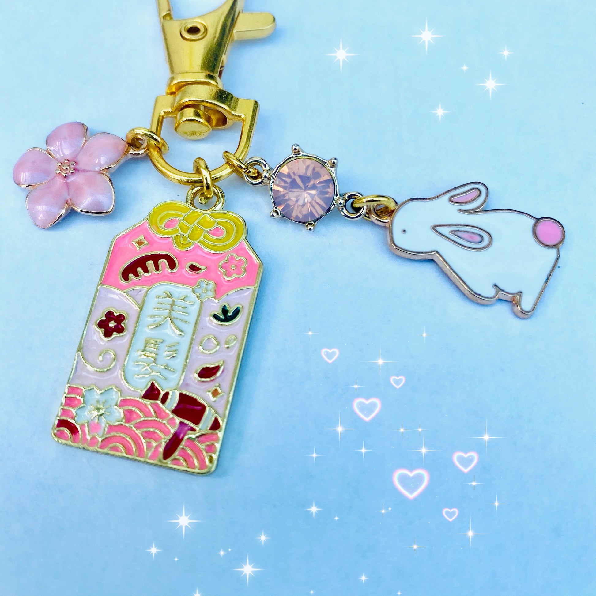 Japanese pink Omamori bunny moon sparkle gem keyring with flower charm