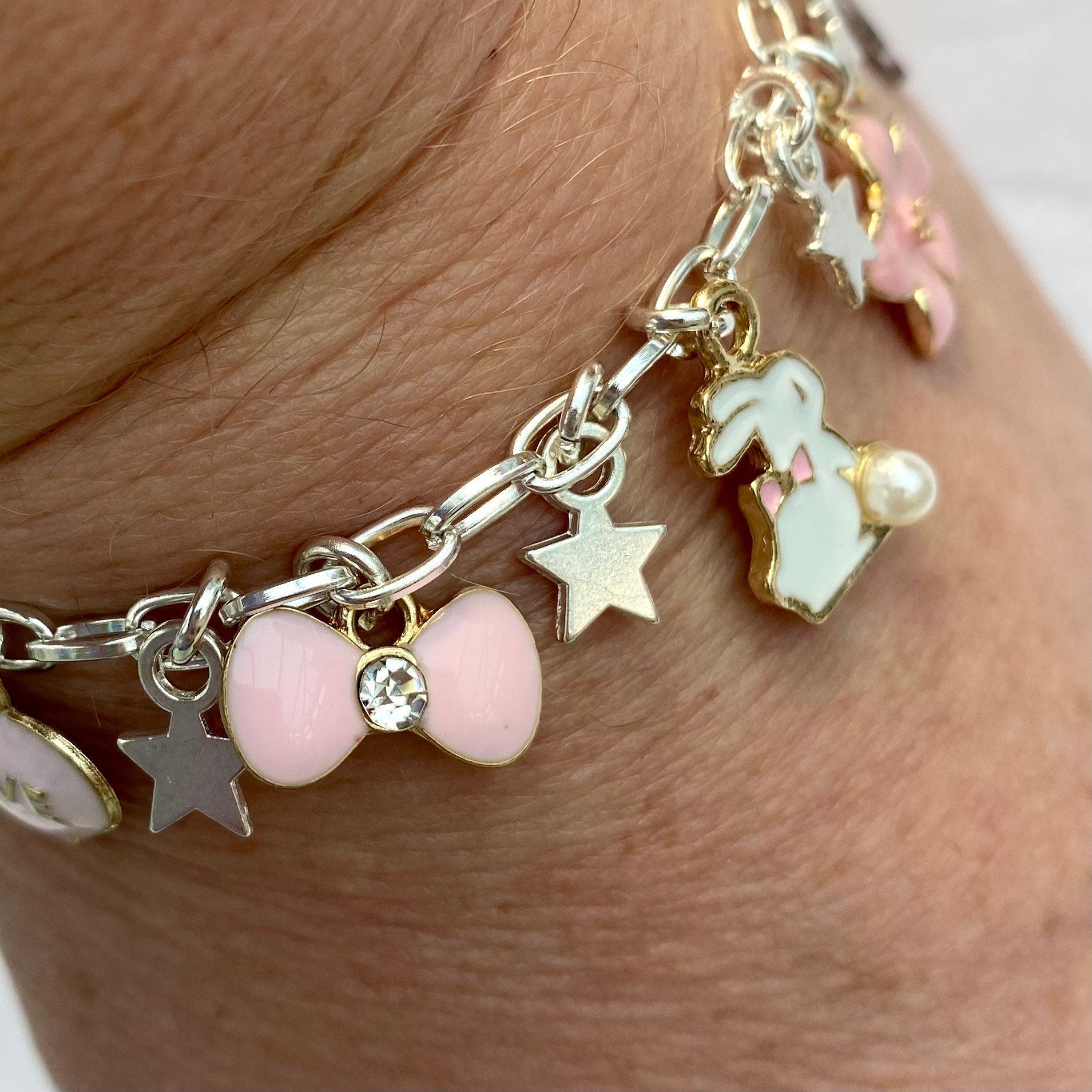 Charm bracelet silver chain cute anime bunny Sakura pink crystal kawaii charms