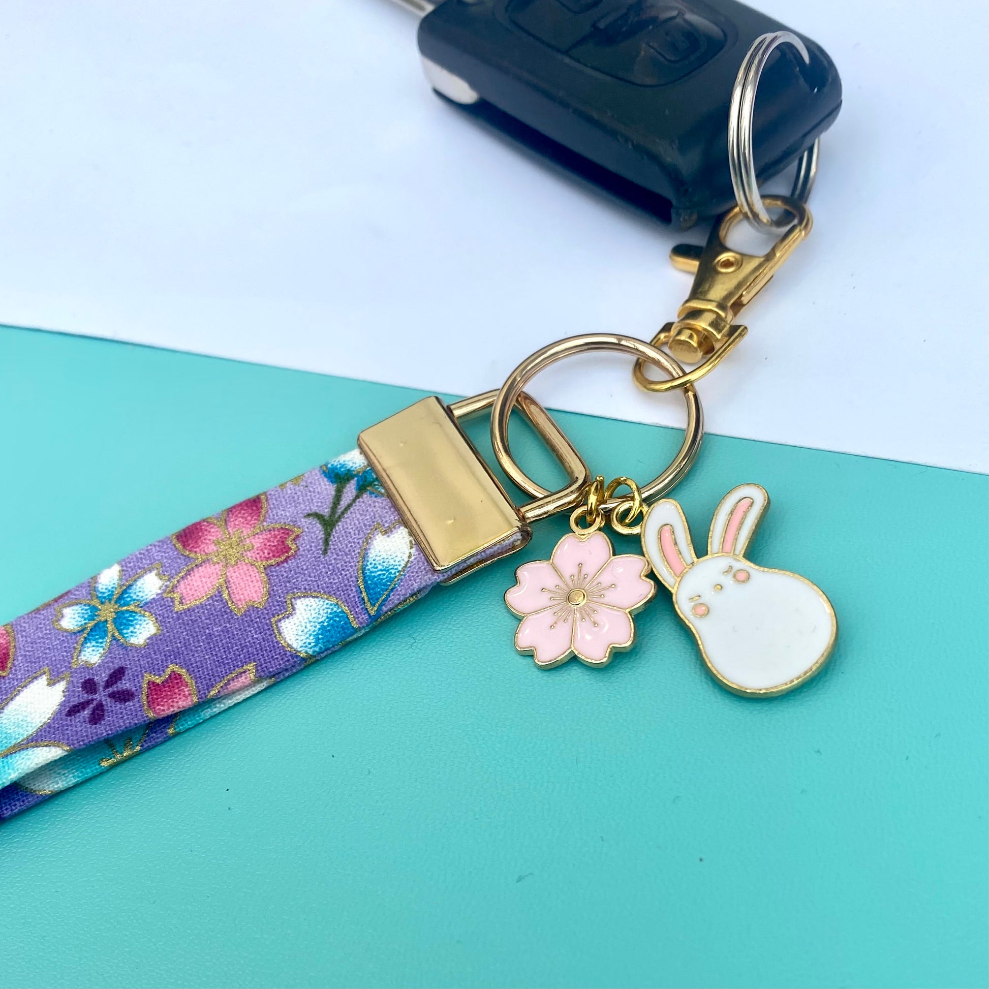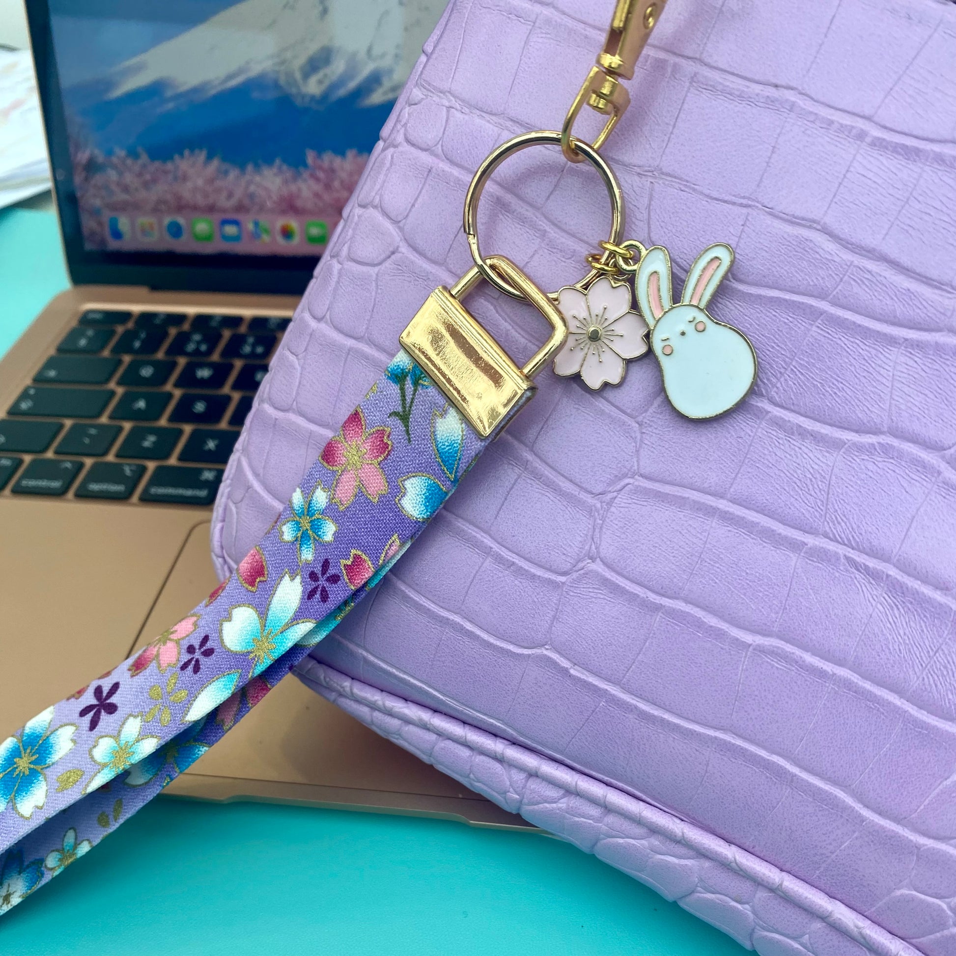 Sakura blossom pattern Japanese kimono style wristlet with lucky sakura bunny blossom charms. Carry your good luck with you for travel safety and success in life.
