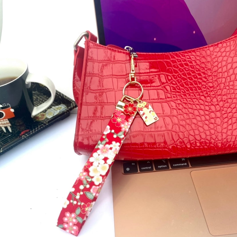 Sakura blossom pattern Japanese kimono style wristlet with lucky sakura bunny blossom charms. Carry your good luck with you for travel safety and success in life.