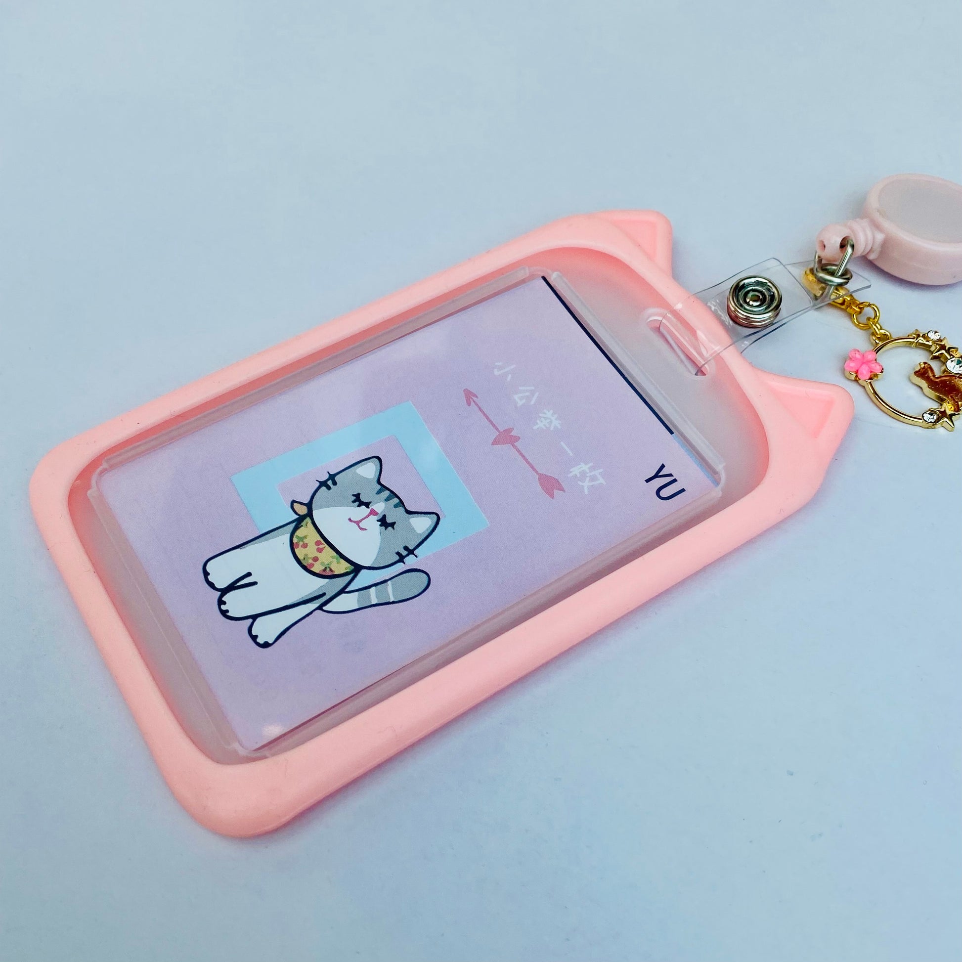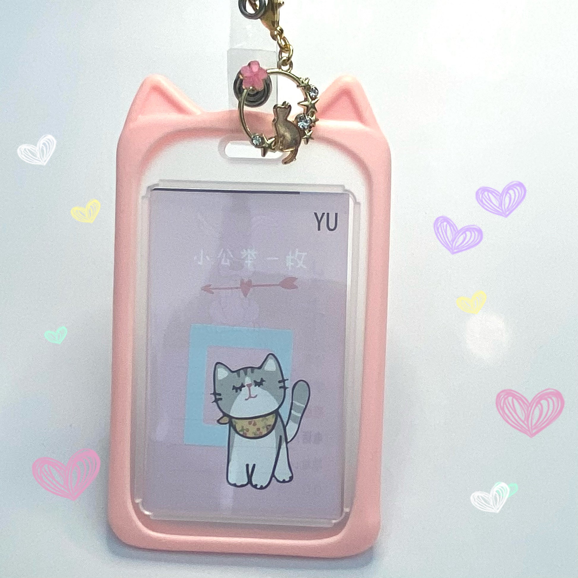 Cute Kawaii style student campus ID bank card photo holder with baby pink lanyard and cats ears. Great credit /bank card travel pass cover card clear plastic front and back . Good protective cover for k pop photo cards and cash notes. Cute Korean/Japanese anime style on bag or round neck.