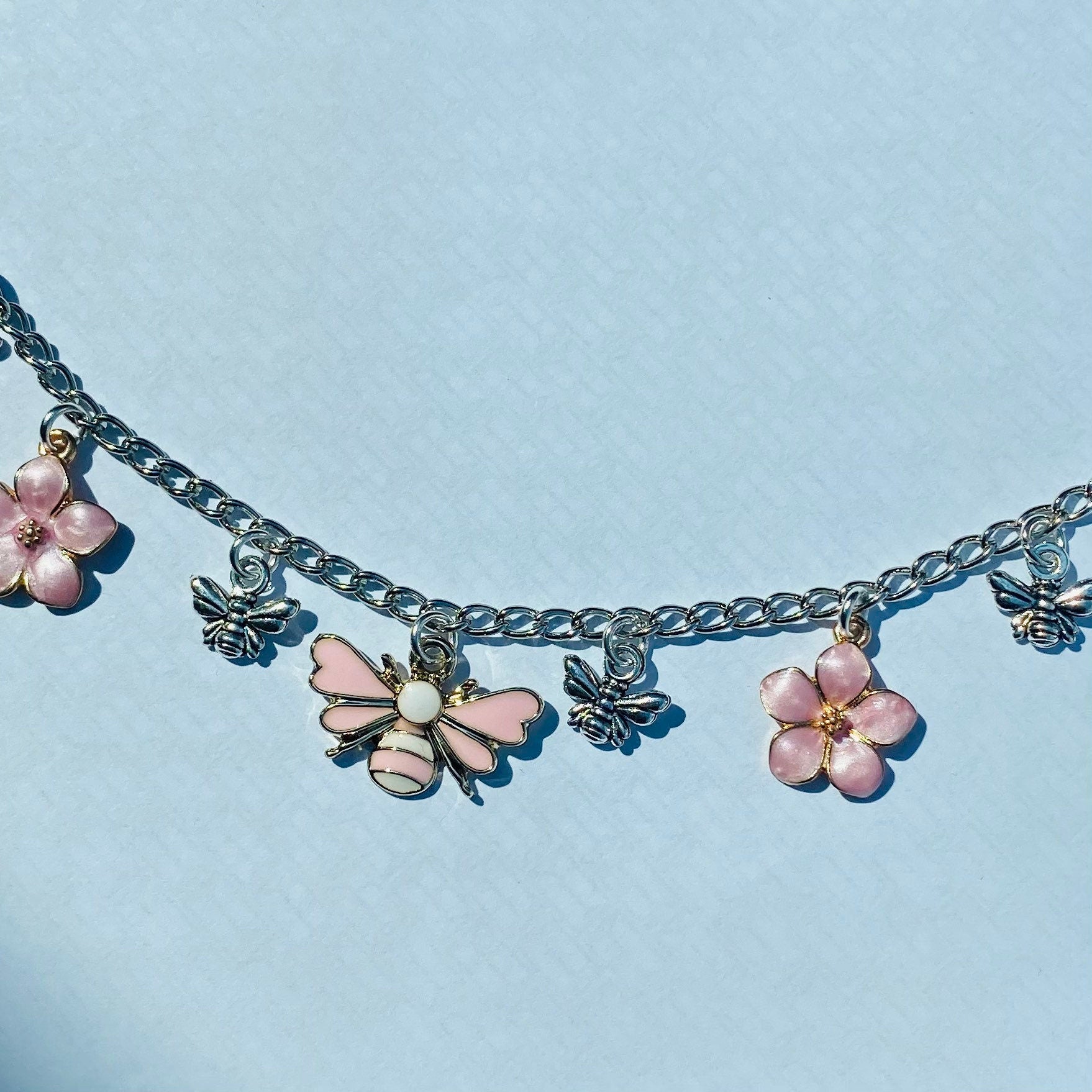 🌟Lovely pink bee statement necklace on a silver chain with small bee charms
