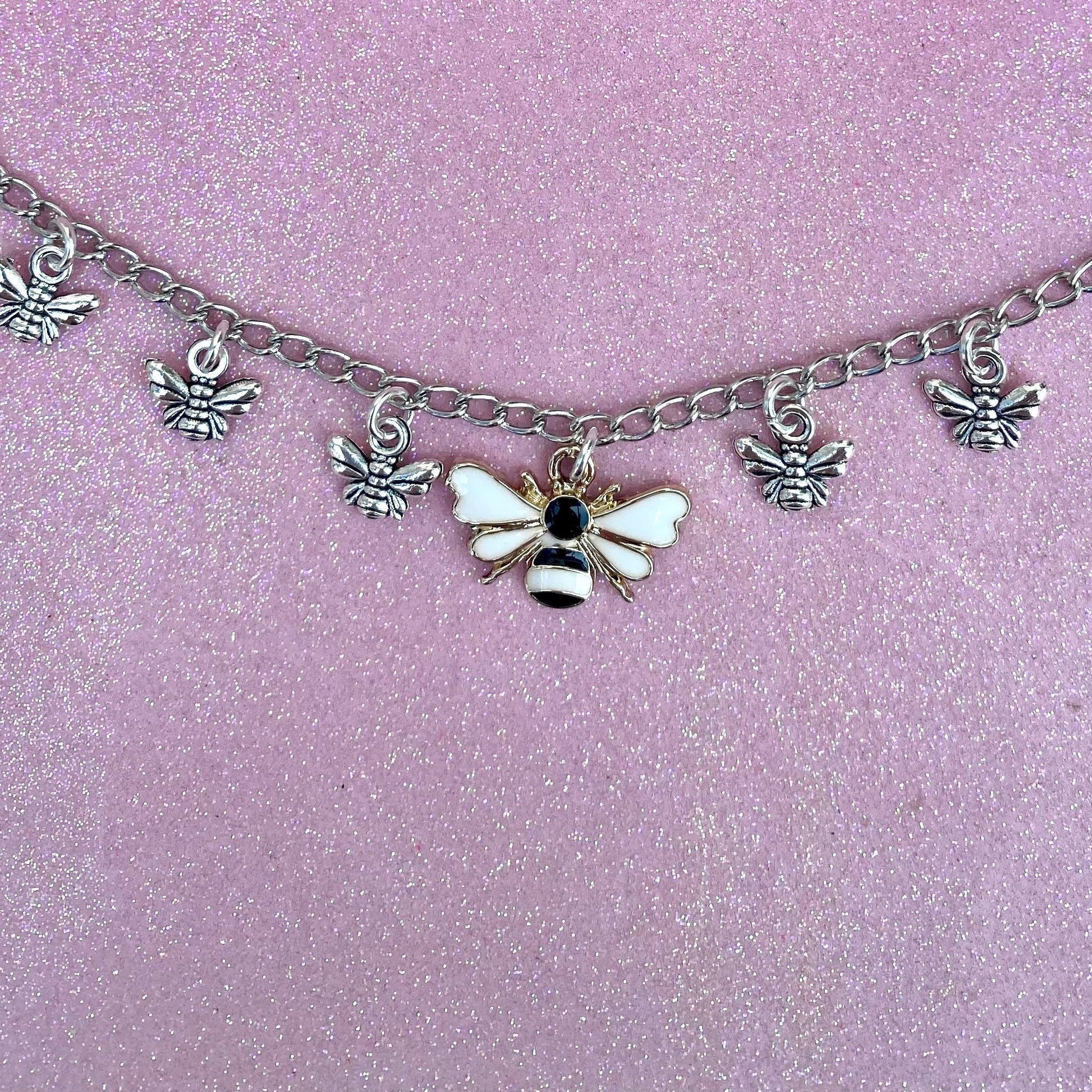 🌟Lovely black and cream bee statement necklace on a silver chain with small bee charms
