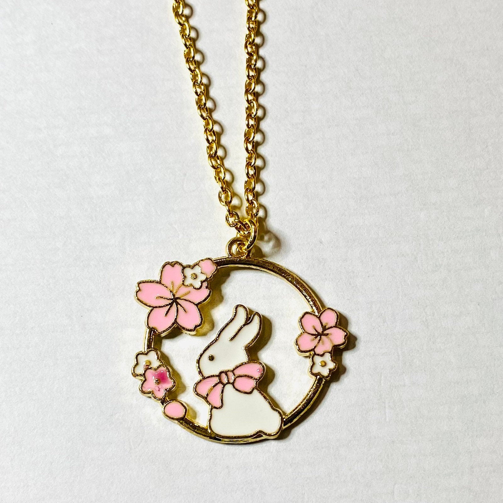 Japanese sakura white anime bunny necklace . Kawaii moon pink pastel gold chain sakura flowers celestial gift