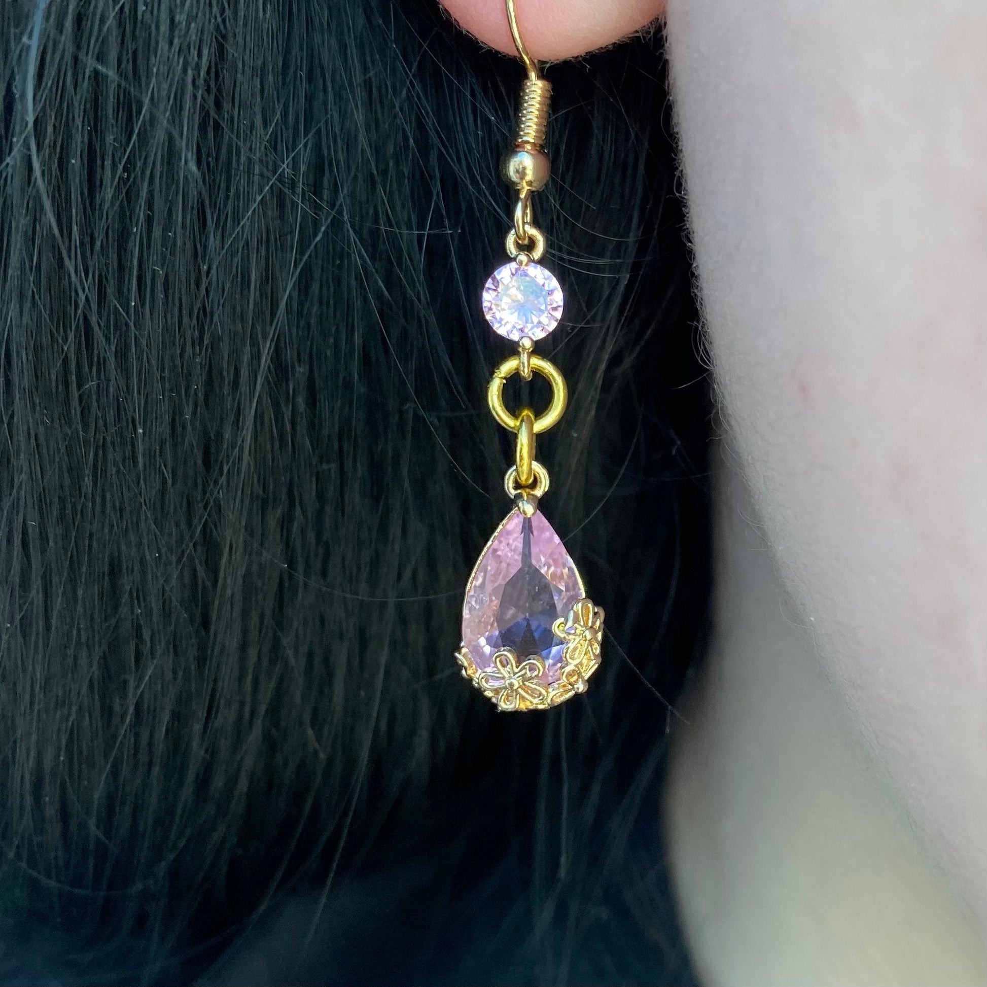 Pair of handmade sakura blossom embossed pink crystal style earrings set in claw setting . Really pretty in the light